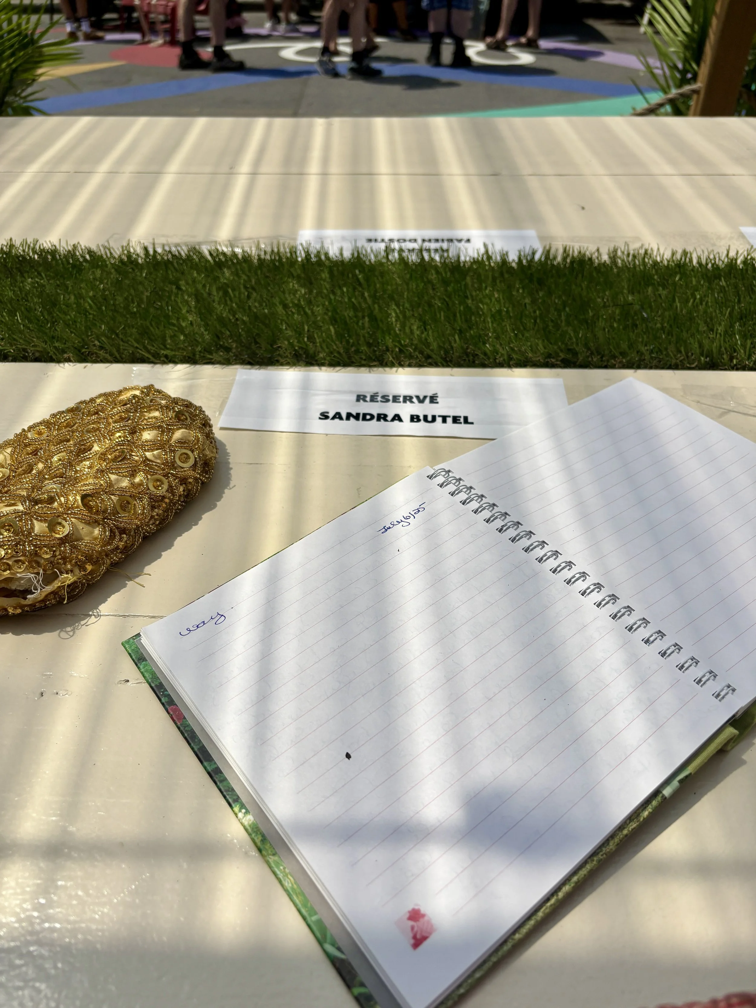 The French Canadian announcer yells out “Douze minutes” and my nervous system is on guard for the start of the match. Already I have trickling sweat gathering in my short and sweet smart wool socks that are soon to be short and sweaty. The volume of the loud speaker is being gradually increased as the minutes to start time are counted down one by one. My backpack is piled up on my knees, my latest lined journal open in front of me; my uncharged laptop plugged in back at home in the relative cool. A blow up pink flamingo hangs above a Luchadora masked skeleton, bony feet planted on the melty pavement. This is not any ordinary day and not any ordinary occasion. Something big is about to happen here and I get the sense that we all know it.