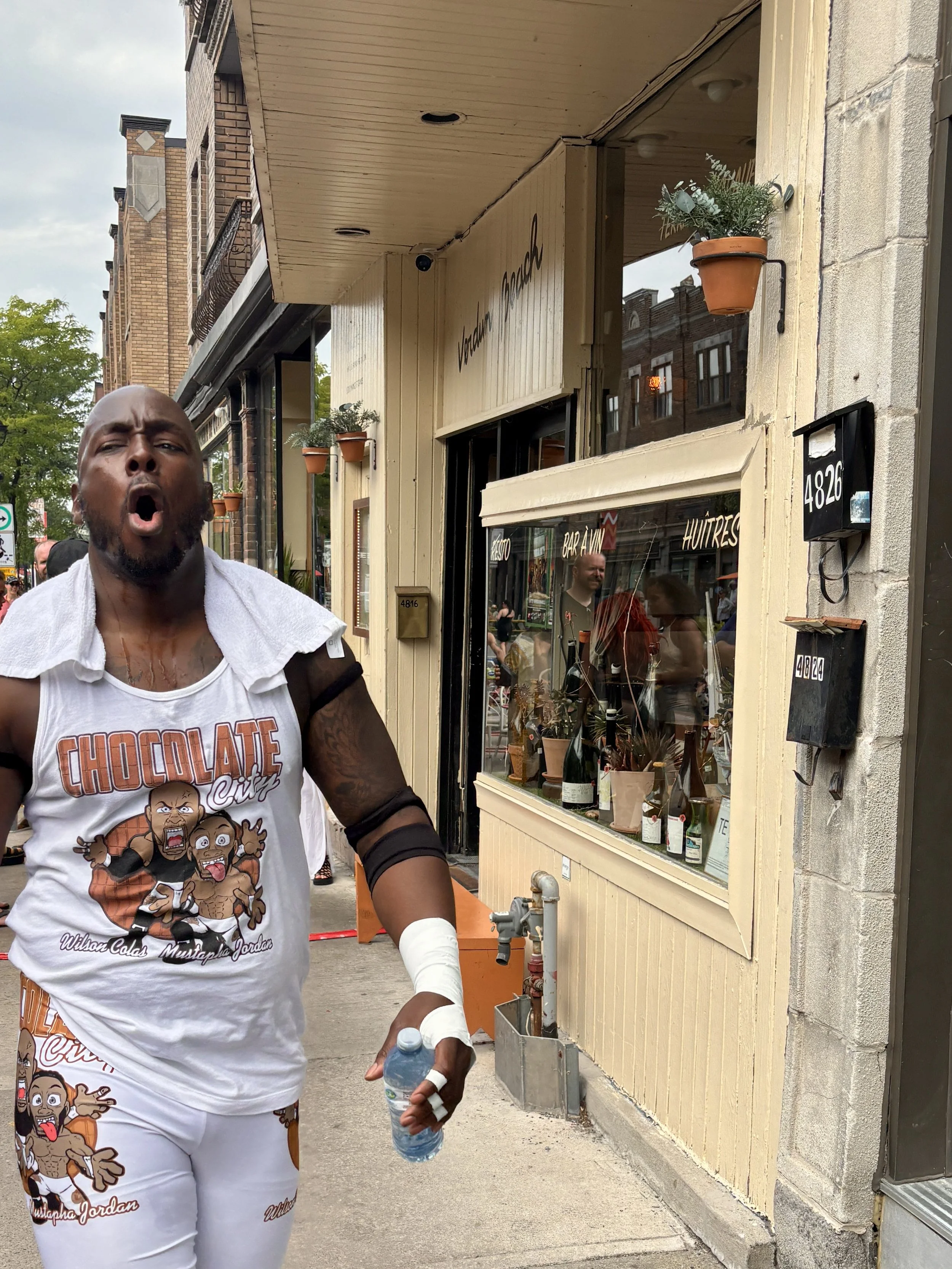 The second half of Lutte Symmania’s main event opens up with a local favourite, an Italian from the neighbourhood against our first wrestler of colour. Everyone is yelling “sexy, sexy, sexy” as Sexy Chocolate is his name. Francis joins me now and my writing slows to be with him at the moment. We exclaim back and forth at the spectacle as he lets himself get swept up in the action. We smile and laugh together at the ridiculous electricity of the happenings around us, nodding our heads once again at how much we are grateful to be brand new adoptees of the “arrondissement de Verdun”. How quickly and completely we have been welcomed with open arms. How quickly and completely we have come to feel at home.
