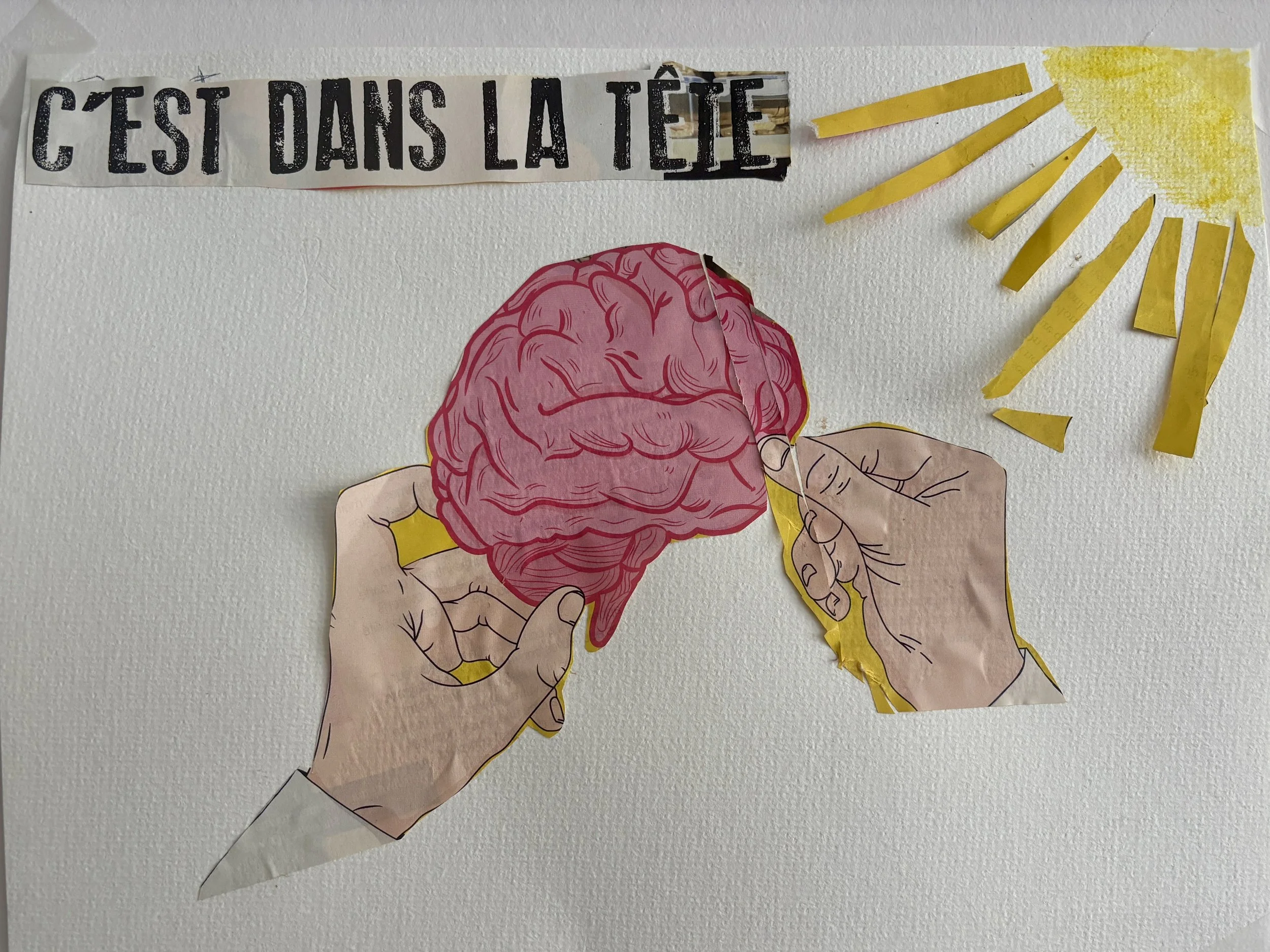 There are a few signs on the wall that I notice each time we make our way from our movement practice to our seated visualizations. One translates as, “What is said at the centre stays at the centre” and another, “It’s all in your head,” with an image of two hands holding a pink brain with delicate care while the rays of the sun shine on it to warm it up. These are tangible reminders that I am in the right place; where even the collaged pieces of art on the wall reflect my journey back to me with such accuracy and clarity. Permission is being granted here and I find myself softening into the power of safety and discovery that are being offered here.